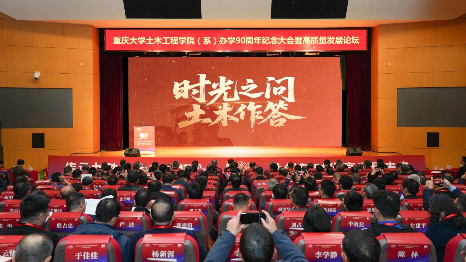 重庆大学校长、中国科学院院士刘昌胜教授,中国工程院院士、重庆大学土木工程学院教授周绪红,中国工程院院士、重庆大学土木工程学院名誉院长杨永斌,中国工程院外籍院士、重庆大学土木工程学院教授田村幸雄,中国工程院院士、深圳大学土木与交通学院院长陈湘生,中国工程院院士、重庆大学土木工程学院教授刘汉龙,中国工程院院士、中南大学土木工程学院教授余志武,中国科学院院士、中国人民解放军陆军工程大学教授方秦,中国工程院院士、同济大学土木工程学院教授李国强,中国工程院外籍院士、河海大学未来技术学院院长谢亿民,以及重庆大学原党委书记、原重庆建筑大学校长祝家麟,全国政协常委、九三学社中央原副主席赖明,住房和城乡建设部标准定额司原一级巡视员、中国建筑节能协会会长倪江波,中国建筑工程总公司原副总经理曾肇河,云南师范大学原党委书记叶燎原,中国建筑股份有限公司原总工程师毛志兵等专家领导、杰出校友、企业嘉宾、兄弟院校代表、学校机关部处领导和在校师生等600余人欢聚一堂,共忆九秩土木办学初心,共话新时代高质量未来。大会由重庆大学土木工程学院党委书记谢强主持。
